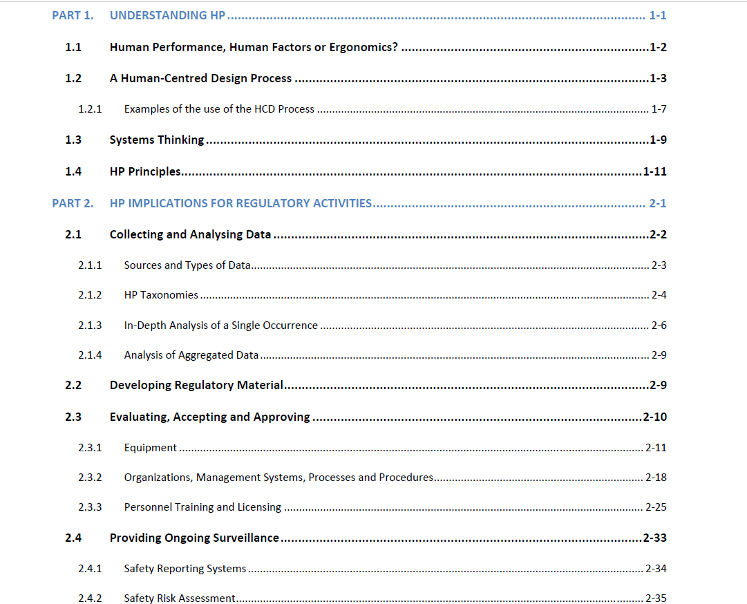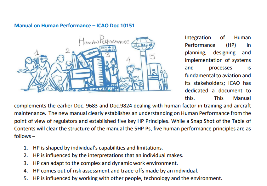Integration of Human Performance (HP) in planning, designing and implementation of systems and processes is fundamental to aviation and its stakeholders; ICAO has dedicated a document to this.  This Manual complements the earlier Doc. 9683 and Doc.9824 dealing with human factor in training and aircraft maintenance.  The new manual clearly establishes an understanding on Human Performance from the point of view of regulators and established five key HP Principles. While a Snap Shot of the Table of Contents will clear the structure of the manual the 5HP Ps, five human performance principles are as follows –